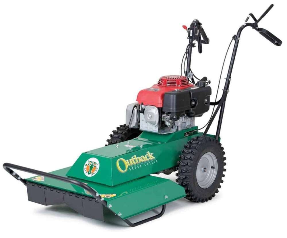 The BC 26 Series Outback, designed for cutting tough overgrown brush, is ideal for cleaning meadows and fields, or cutting paths and trails – wherever dense brush and weeds present a clean-up challenge. The 26″ wide rigid deck commercial-duty brush hog provides excellent stability in deep vegetation. The heavy-duty blade spindle is reinforced on four sides to tackle the toughest cutting conditions, including thick brush up to 6′ high, grass and weeds over 8′ tall, and saplings up to 2.0″ diameter. The heavy-duty mechanical transaxle, featuring three speeds and reverse, combines the transmission and differential into one sealed package with no linkages to snag on brush. And for operator comfort and high productivity, forward and reverse controls are at your fingertips. Coupled with wide plow style handles and hand guards for better leverage and maximum protection, there’s simply no other brushcutter on the market that offers the ease of use and clean-up performance of the BC26 Series Outback Fixed Deck. Key features: * Heavy-duty mechanical transaxle – combines the transmission and differential into one sealed package with no linkages to snag on brush. Three speeds and reverse * Improved shifting from operator station – easy positive shifting between all three forward speeds and reverse * BC2600 rigid deck – provides excellent stability in deep vegetation while mowing meadow * BC2600 heavy duty blade spindle – reinforced in four directions for maximum durability and safety, so you can keep cutting in the harshest conditions * Rubberized rear deck trim – allows for easier stump clearance in reverse * Ergonomically-angled control handles with padded grips – intuitive drive controls make it easier for the operator to move forward and reverse conveniently from the handles. Wide plow style handles with padded grips and knuckle guards provide maximum protection and leverage in deep brush * Puncture resistant tires -16″ wheels and puncture resistant tires Specification: Briggs and Stratton Engine Capacity (cc) 344 Cutting path width (mm) 660 Weight (kg) 166