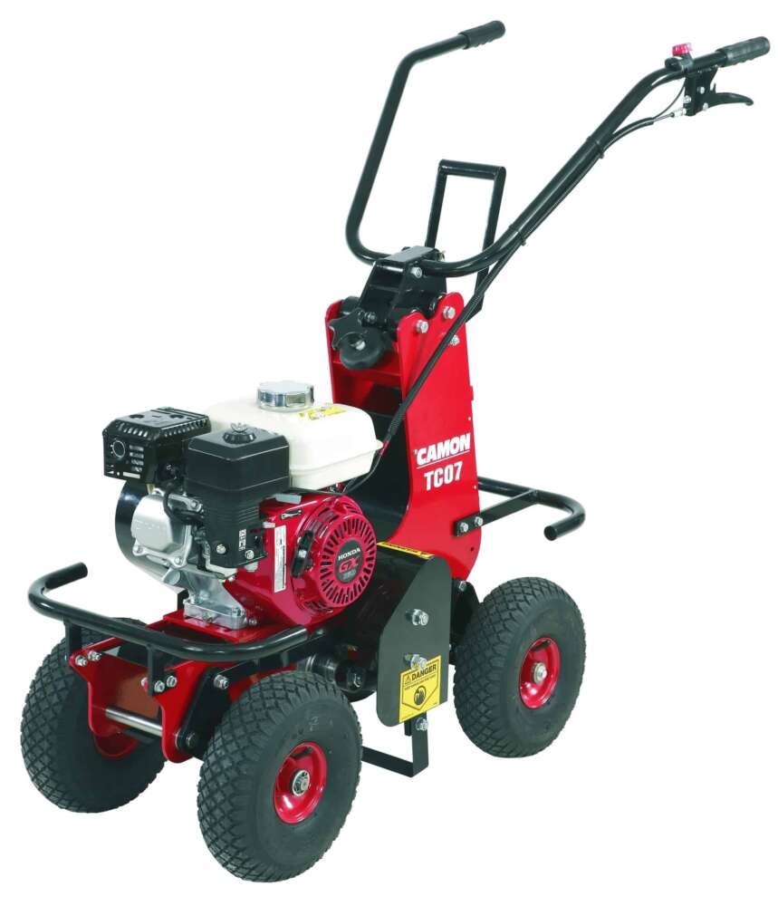 Designed and manufactured by Tracmaster, the CAMON TC07 Turf Cutter is a highly effective self-propelled machine that will cut a 12″ wide strip of turf cleanly, quickly and effortlessly.
