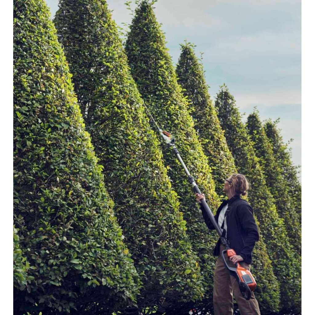 Husqvarna 520iHT4 is a high-capacity battery-powered telescopic pole hedge trimmer with up to 4.5 m reach, designed for professional use. It cuts wide, high and low hedges efficiently thanks to the length adjustable telescopic tube and angle adjustable cutter bar. The cutter bar also folds easily for easier transport and storage. This machine combines market-leading performance with zero direct emissions, low weight, low vibration levels and extremely quiet operation, so you can use it in noise-sensitive environments. The rear impact guard protects the integrated battery to prevent wear and damage effectively. Compatible with all Husqvarna BLi-batteries and chargers. Weatherproof IPX 4.