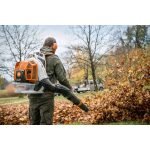 Excellent power to weight ratio makes the BR 800 easy to operate. Thanks to the ergonomic carrying system (S shaped shoulder strap, chest strap and hip belt) it is comfortable to use throughout the day. The strain reducing blower tube makes it easy to handle too. A handy eyelet is located in the backplate which allows you to hang the blower up for storage. Starting the machine is simple and easy to do thanks to the side start pull cord. The blower can be easily restarted when taking a break from work with a firm pull of the cord. And of course it can also be stopped using the switch on the handle so there’s no need to remove the machine if you’re taking a quick break or wanting to move from area to area.