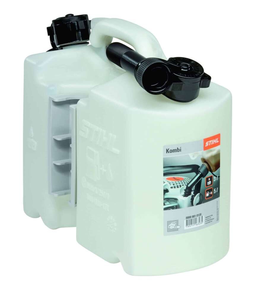 Twin canister for transportation of 5 litre fuel and 3 litre chain oil.