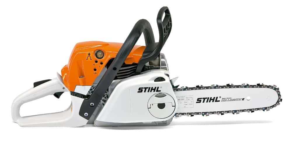 Compact chainsaw with good power-to-weight ratio and hard-wearing STIHL Rapid Duro 3 low-profile saw chain. With up to 20% less fuel consumption and up to 70% fewer emissions compared to STIHL two-stroke engines of the same performance class without 2-MIX technology. Ideal for cutting firewood, felling small trees and when a bit more power is needed. This saw is easy to guide and has great handling. With STIHL Quick Chain Tensioning and STIHL ErgoStart. Technical Details Displacement cm³ 42.6 Power output kW/bhp 2/2.7 Power-to-weight ratio kg/kW 2.6 Weight kg 5.1 Sound pressure level dB(A) 103 Sound power level dB(A) 114 Vibration values left/right m/s² 3.9/3.9 STIHL Oilomatic saw chain pitch/type 3/8″ P Features Reduced-emission engine technology Anti-vibration system Single-lever master control Pre-separation air filtration system Manual fuel pump (Purger) Tool free filler caps Chain Quick Tensioning (B) Ematic chain lubrication system STIHL ErgoStart (E)