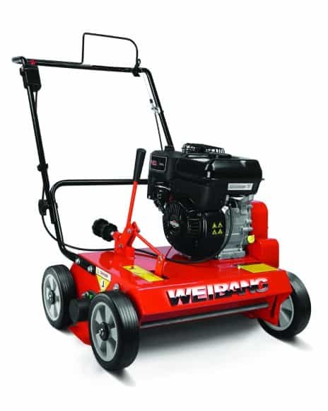 Product information: The Weibang WB486CRB is controlled by a clutch system, the scarifying rotor is fitted with 28 double tipped carbonsteel blades. Raking depth is fully adjustable to a maximum 7cm, to remove moss and thatch and aerate roots gently but effectively.