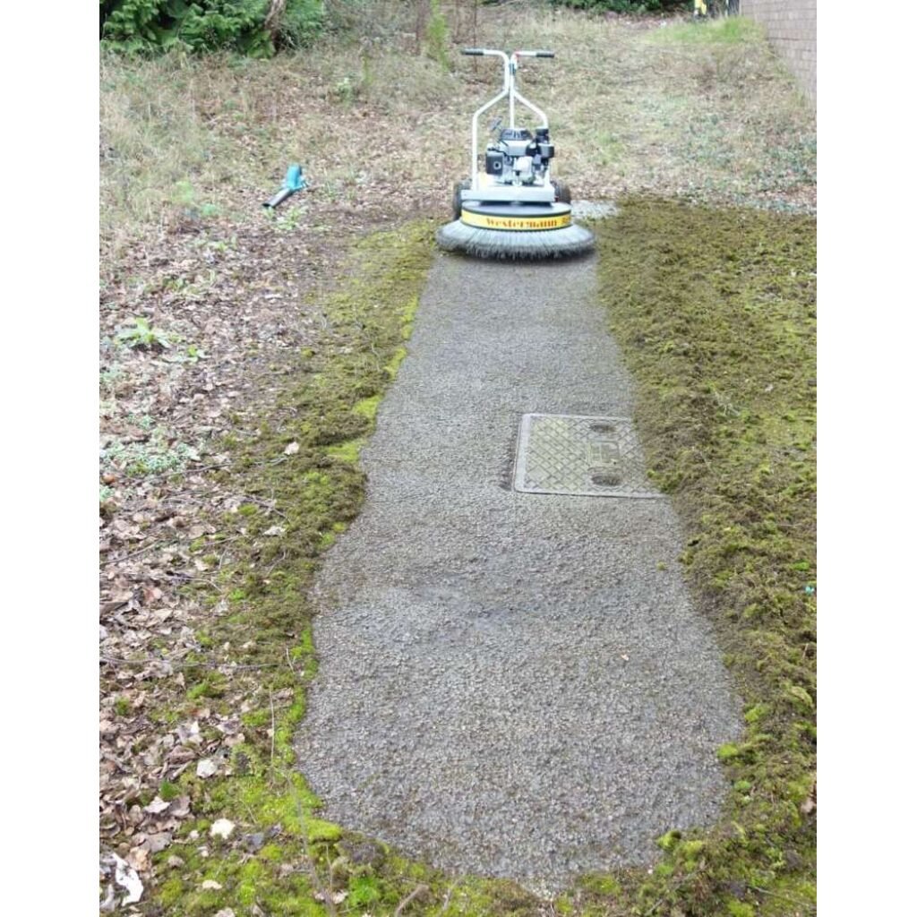 Manufactured in Germany, the belt driven machine comes with a jockey wheel situated underneath the brush that allows you to adjust the height of the bristles, enabling an aggressive or light brushing action. Thanks to the professional design, even on the most aggressive setting, the brush will not cause damage on block paving, tarmac and concrete. For more delicate surfaces we always recommend to carry out a test patch first.